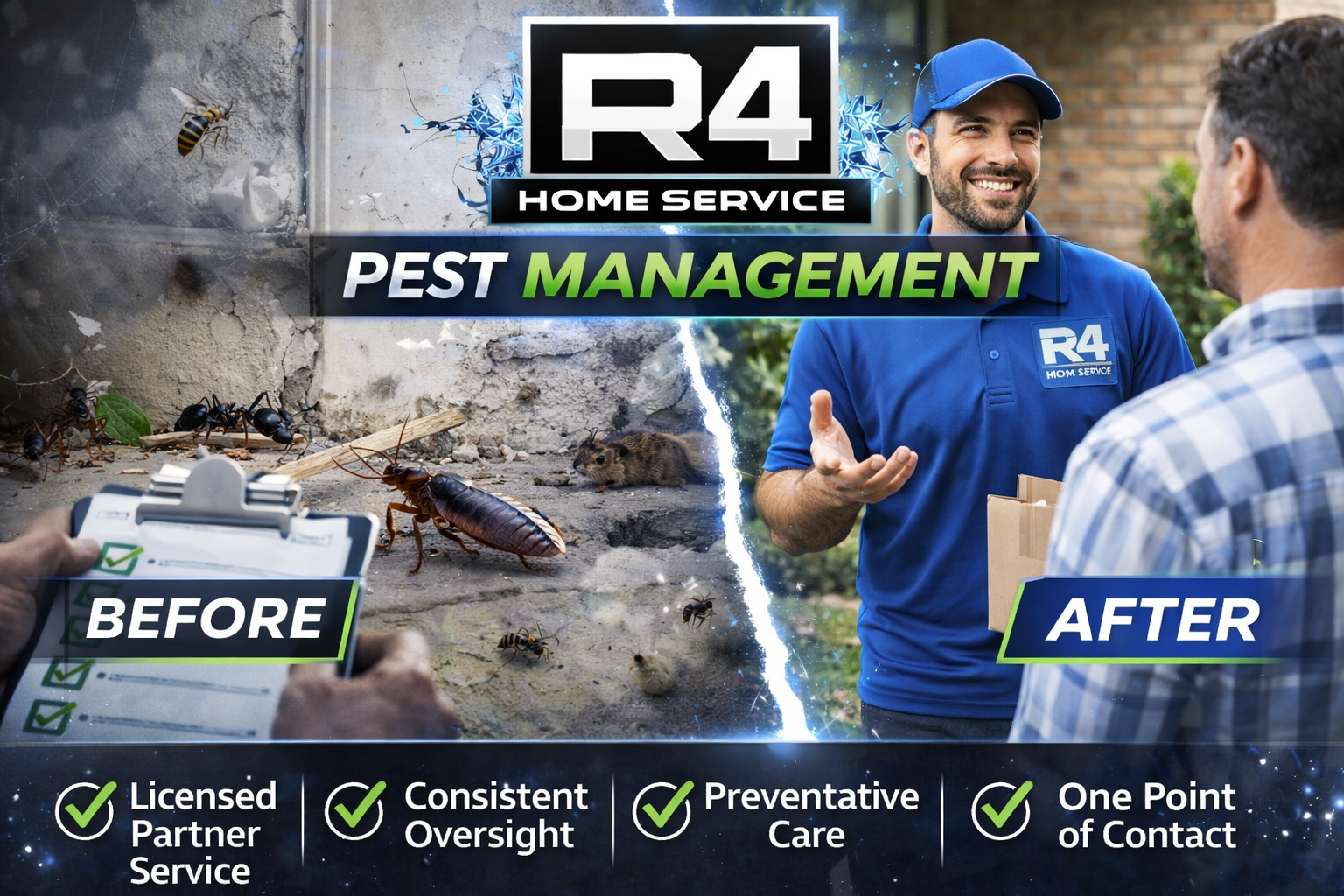 Instead of searching for pest companies, comparing quotes, and managing scheduling, R4 membership clients benefit from: